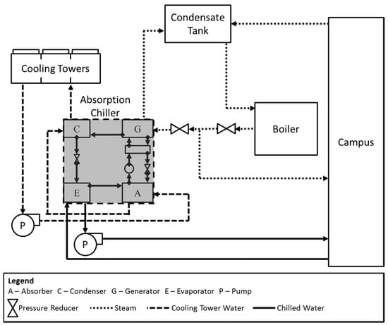 The absorption chiller is classified as single effect; a typical cycle schematic is shown in Figure 2. The steam the absorber uses is fully condensed and throttled to meet a chilled water temperature difference and set point. The absorption chiller operates continuously throughout the cooling season except during routine maintenance. The absorber and condenser components exhaust heat to an induced draft cooling tower which operates in a primarily dry environment. Additional chilled water loads are accomplished through the use of electric vapor compression chillers. The chilled water produced is utilized for cooling buildings and processes on campus.