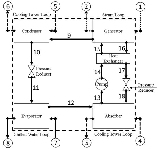 Using the model analysis the dominant sources of exergy destruction are the condenser (27.6%), absorber (30.5%) and generator (30.6%). The model conclusion also compares well with the analysis of exergy destruction rates presented by Morosuk and Tsatsaronis. They indicated that the absorber and generator should be the primary focus for improvement []. Morosuk and Tsatsaronis were able to identify that the heat exchangers that contained both the highest temperature differences as well as the mixing and separation of LiBr and water should generate the most exergy destruction in the system. This is also identified by the model results. However, since the model is constructed for a specific system, the operating parameters and conditions will differ. In order to validate the model, the model was setup to predict flow rates and temperatures at several points to compare to the given data, shown in Table 6.