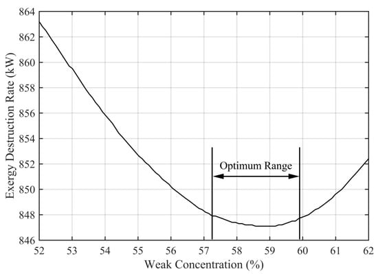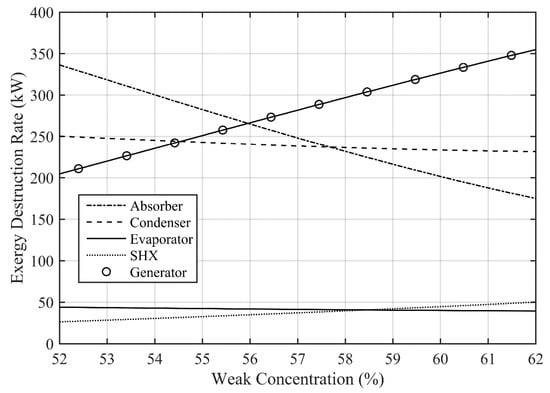Total exergy destruction, shown in Figure 5, a minimum point is expected in the 57%–60% range; as the chiller is designed to operate in this area. Temperatures, heat sources, flow rates, and heat exchangers were designed for these operating ranges and adjustments significantly outside of this region would not typically be available. The total exergy destruction rate indicates a minimum at 58.8% lithium-bromide concentration; this would result in a decrease of exergy destruction rate of 0.4% and a decrease in the maximum cooling capacity by 3%.