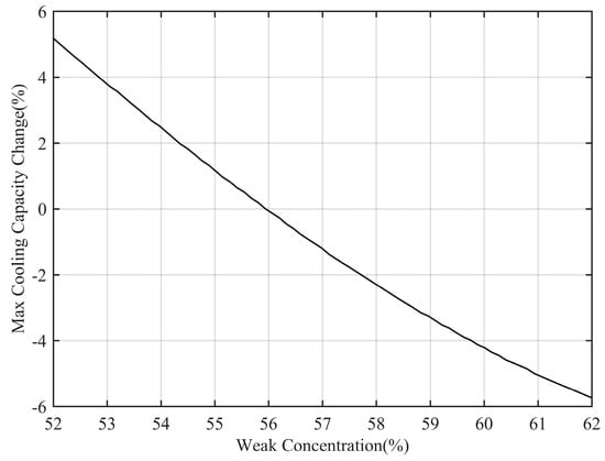 Changing the solution concentration has an effect on cooling capacity, shown in Figure 4. The analysis shows that in increase in maximum cooling capacity is expected as the concentration is reduced from 56%. By increasing the concentration of lithium-bromide the maximum capacity decreases. This change is nearly proportional to the increase in concentration.