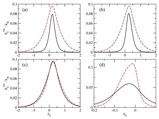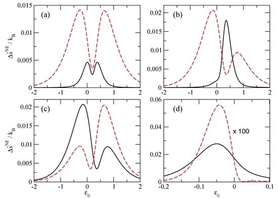 Figure 3 shows the dependence of the entropy calculated for different transport regimes. Once more, we can see that is always a positive quantity. The positiveness of is obtained when the system has a single chemical potential (see Figure 3a) as well as when there are both chemical potential and temperature differences between the reservoirs (see Figure 3b,c). In Figure 3d, we show the behaviour of the entropy for the same parameter used in Figure 1d and we recover the same qualitative behaviour as shown in Figure 3b of [11]. The amplitude of the entropy is larger in the weak coupling limit in comparison to the strong coupling limit to the reservoirs. One should, however, note that, in Figure 3, has the dimension of an entropy, i.e., [energy]/[temperature], while in Figure 3b of [11] and Figure 1, we are dealing with an entropy production rate, i.e., a quantity with dimension [energy]/[temperature × time].