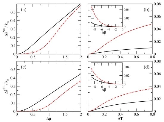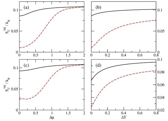 In Figure 2, we show how the NE entropy production rate depends on the NE conditions, i.e., on the chemical potential difference (see Figure 2a,c) or on temperature difference between the reservoirs (see Figure 2b,d). First, it is important to note that, for all the parameters used, the NE entropy production rate is always a positive quantity (as expected). Furthermore, increases when the NE conditions are more important, i.e., when or increases. In other words, the more the system is out of equilibrium, the larger the entropy production becomes.