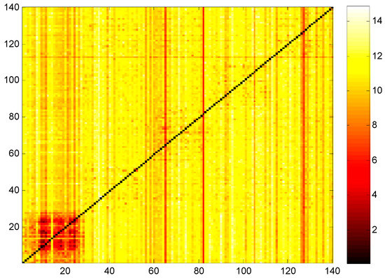 Based on Formula (4), we calculate the transfer entropy of the rate of change on electricity consumption among different industrial sectors in five provinces of South China. As noted in Section 3, we list totally 140 exclusive industrial sectors of provinces (i.e., we issue different codes for same sectors from different provinces) ranking from 1 to 140 by industrial sectors of GD, GX, YN, GZ, and HN.