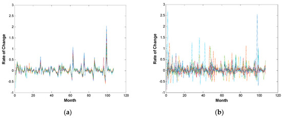 According to the information extracted from the nine dark grid blocks, we plot the line chart of the rate of change time series. Different color lines correspond to different industrial sectors. We find that the industrial sectors in Figure 3a have a higher degree of uniformity on the fluctuation of the rate of change, while the ones in Figure 3b do not show synchronization features. Hence, the transfer entropy is able to interpret the homogeneity of the industrial sectors to some extent, and it has shown that lower entropy volume always corresponds to a higher degree of order.