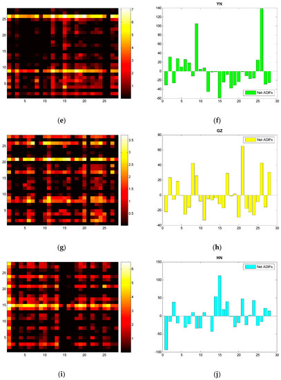 Heat maps of the five provinces based on ADIF (Asymmetric Degree of Information Flow): (a) GD; (c) GX; (e) YN; (g) GZ; (i) HN; Net ADIF histograms: (b) GD; (d) GX; (f) YN; (h) GZ; (j) HN.