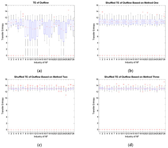 From Figure 5, we conclude that Figure 5f preserves the most features in Figure 5e. This implies that the target sequence Y contains much information, since the general distribution of in-weight does not change by shuffling X, but by keeping X unchanged. Besides, only shuffling Y (Figure 5c,g) and simultaneously shuffling X and Y (Figure 5d,h) achieve similar effects. By comparing TE with the shuffled data based on the three methods, we demonstrate that the inflows and outflows of transfer entropy from real data are not obtained by chance. Therefore, the characteristics of target sequences can approximately determine the values of the transfer entropy. The industries representing for target sequences tend to be driven industries, other than driving industries. Driven industries usually contain much more information flows and are more influential on determining the order of degree distribution of the whole industrial system.