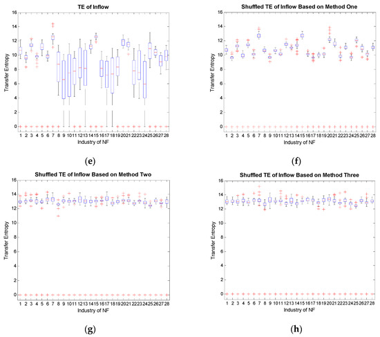 Transfer entropy of South China: (a) initial out-weight boxplot; (b) out-weight boxplot after shuffling X; (c) out-weight boxplot after shuffling Y; (d) out-weight boxplot after shuffling both X and Y; (e) initial in-weight boxplot; (f) in-weight boxplot after shuffling X; (g) in-weight boxplot after shuffling Y; (h) in-weight boxplot after shuffling both X and Y.