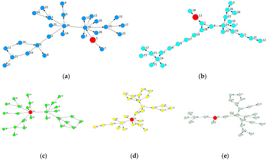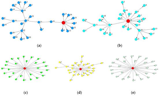 Provincial MSTs rooted in the industry of minimal information outflow: (a) GD (root: V5); (b) GX (root: V13); (c) YN (root: V10); (d) GZ (root: V19); (e) HN (root: V23).