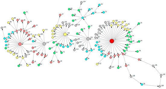 Finally, illuminated by the intuition of taxonomy from the conventional minimum spanning tree, we step further with Chu–Liu–Edmonds MST algorithm [53,54] using the pseudo-distance above, and extract the directed minimum spanning tree from the transfer entropy networks, which may be interpreted with route and transmission recognition.