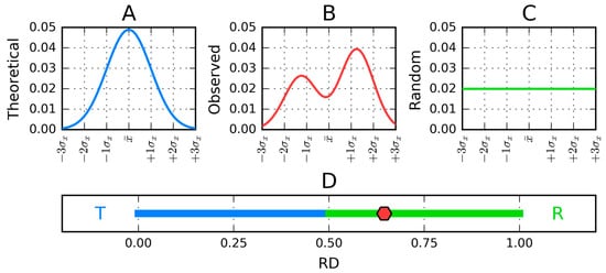 One-dimensional representation of fuzzy oil drop model parameters. (A) The leftmost chart (blue) presents the idealized Gaussian distribution (T) while the chart on the right corresponds to the uniform distribution (R) (green). (B) Actual hydrophobicity distribution (expressed by the RD parameter—red line) for the target protein is shown in the center and marked on the axis with a red dot. According to the fuzzy oil drop model, this protein contains a well-defined hydrophobic core. (C) Uniform distribution without any concentration of hydrophobicity in any point of the protein body. Vertical axes represent hydrophobicity, while horizontal axes represent distance (in multiplicities of σx). According to the three-sigma rule, the range between 0 + 3σ and 0 − 3σ covers more than 99% of the entire probability expressed by the Gaussian—hence a range of −4σ to +4σ is plotted. (D) The bottom axis shows the full range of the RD coefficient—from 0 (perfect Gaussian) to 1 (uniform distribution with no concentration of hydrophobicity at any point in the protein body).
