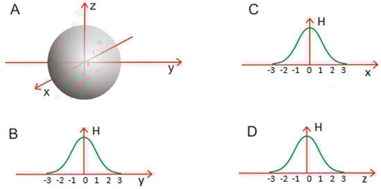Describing the protein structure with a 3D Gaussian Function—The spectrum of ellipsoid forms discussed in this section can be applied to protein structures. We begin by aligning the protein in such a way that its geometric center lies at the origin of the coordinate system. The molecule is then rotated so that its long diagonal coincides with the Y axis, while in the XZ plane the line connecting the most distal atoms (typically effective atoms, i.e., averaged-out positions of all atoms belonging to a given residue) runs parallel to the X axis. We then assume that the size of the molecule along each principal axis is equivalent to the corresponding sigma parameter, yielding a 3D Gaussian which fully encapsulates the protein body. This “fuzzy oil drop” model has been applied in the analysis of a variety of globular proteins [,].