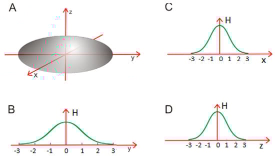 An elongated globular micelle which satisfies σy > σx = σz (A); (B–D)—The distribution of hydrophobicity is stretched along the Y axis, with the remaining two axes (X and Z) unchanged. The cross-section in the XZ plane remains circular.