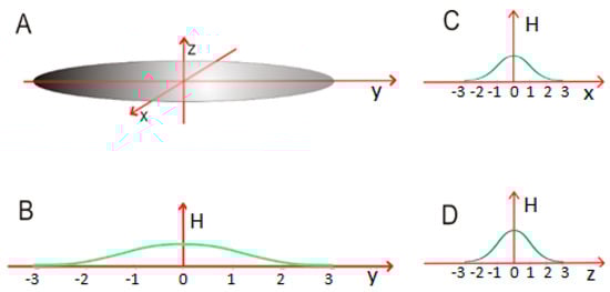 Cylindrical micelle—once σy reaches a high enough value, the central portion of the capsule starts to resemble a cylinder, with a nearly uniform cross-section radius. This can be expressed as σy >> σx = σz. The central portion is adequately described by a two-dimensional Gaussian function which no longer depends on the values of Y (as shown in Figure 4A).