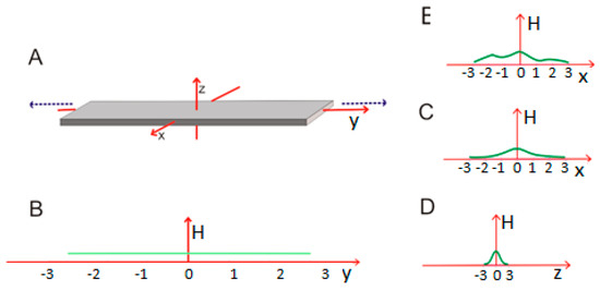 A ribbonlike micelle. (A) distribution of hydrophobicity in a ribbonlike structure composed of polar molecules; (B–D) hypothetical distribution of hydrophobicity along each axis. This situation corresponds to σy >>>> σx > σz; (E) distribution along the X axis may deviate from the Gaussian.