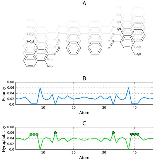 Figure 6 illustrates a ribbonlike micelle made up of Congo red molecules. Figure 6A shows a single dye molecule and the placement of polar groups with its phantom copy. Figure 6B depicts the distribution of charges []. Figure 6C reflects the distribution of hydrophobicity, calculated by flipping the chart shown in Figure 6B, on the assumption that the hydrophobicity is equivalent to “non-charge”. The values shown in Figure 6C are calculated as follows: the absolute values of partial charges were normalized (PC). The pseudo-hydrophobicity was expressed as 1-PC. Finally, Figure 6D reveals the aggregation of highly hydrophobic areas in successive molecules. This type of aggregation persists even though actual Congo red molecules adopt a spiral (rotated) conformation due to the presence of an angled bond in their benzidine group.