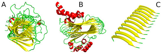Cylindrical protein micelle—this structural form occurs in proteins which comprise β-helix motifs (also referred to as solenoids). Here we describe a lyase—bacterial chondroitinase b pectate lyase (PDB ID: 1DBG) [] and cell adhesion proteins such as Bordetella pertussis virulence factor p. 69 (PDB ID: 1DAB) []. Figure 7A illustrates the solenoid fragment of lyase (1DBG) as an example of a cylindrical protein micelle.