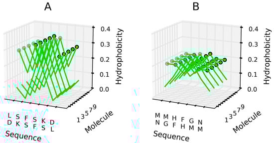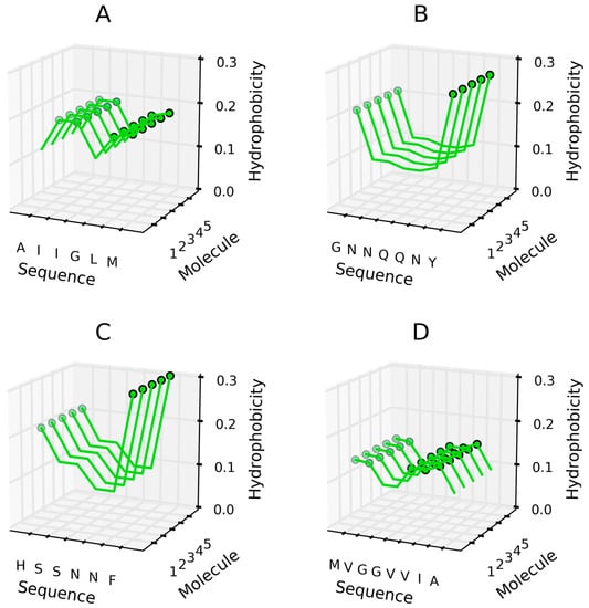 Experimental studies concerning amyloidogenesis point to the special role of hydrophobic residues [,,]. If interactions between residues forming the sequence do not promote the formation of a common, central hydrophobic core, a different type of ordering may take hold—one in which local peaks and troughs aggregate linearly.