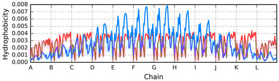 To conclude, the presented results indicate that the lack of a prominent hydrophobic core, along with exposure of the hydrophobic residues, promote the formation of fibrillar structures. Applying the same mechanism to other proteins reveals a local ordering which is inconsistent with the fuzzy oil drop model and instead resembles an amyloid. Similarities between the distributions illustrated in Figure 11 and Figure 12, and the one presented in Figure 13 should be noted—clearly, both cases favor linear propagation of similarly ordered fragments []. The lack of a hydrophilic shell (cf. Figure 11—low hydrophobicity in terminal sections) prevents “closure” and, consequently, enables linear propagation of the complex.