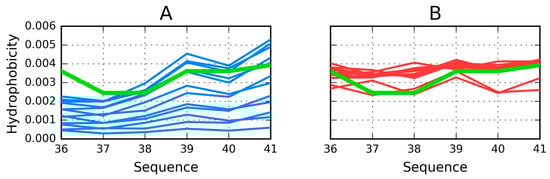 T (blue), O (red), and H (green) distribution in the 36–41 fragment (β-sheet). (A) comparison of theoretical (T) and intrinsic (H) distributions; (B) comparison of observed (red) and intrinsic (green) hydrophobicity to visualize the observed hydrophobicity following the intrinsic hydrophobicity and not following the theoretical one.