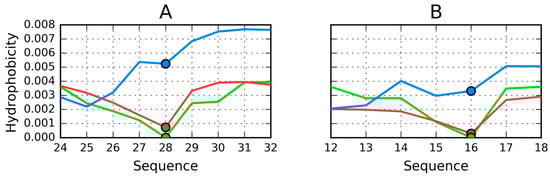 Further analysis of the distributions presented in Figure 13A suggests a major local hydrophobicity deficiency at position 28. In contrast, positions 24–26, where low hydrophobicity would be expected, are instead found to be of higher hydrophobicity. This particular fragment is exposed on the surface and therefore greatly reduces protein solubility. We should also note that similar deviations are present in each individual chain, likely as a result of interactions with adjacent chains.