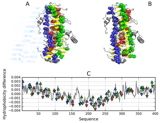 Hydrophobic (A) and hydrophilic (B) residues in 1DBG. vdW (van der Waals) presentation has been applied in both images to highlight selected residues participating in specific β sheets—coding system shown in (C). Note the linear arrangement of hydrophobic and hydrophilic bands. The hydrophobicity difference shown in (C) expresses the subtraction of T from O (O−T). Triangle markers denote the maxima and minima in a particular β-sheet. Colors as applied in A and B, respectively.
