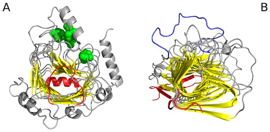 As mentioned in Table 1, a cylindrical micelle can be observed in proteins which contain solenoid-like fragments. We have selected two examples for analysis: a lyase—bacterial chondroitinase b pectate lyase (PDB ID: 1DBG) [] and a cell adhesion protein—Bordetella pertussis virulence factor p. 69 (PDB ID: 1DAB) []. Linear propagation in both proteins is visualised in Figure 14. In order to prevent infinite propagation, a “stop” signal is necessary. This role appears to fall to the short fragments highlighted in Figure 15 (red coloring).