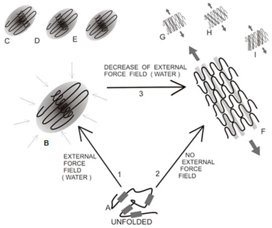 Polypeptide chain folding process, starting with a disordered structure (A); Thick lines represent the hydrophobic fragments of the chain. Path 1 leads to a centralized hydrophobic core surrounded by a hydrophilic shell, which is consistent with the fuzzy oil drop model (B); producing individual soluble molecules. This structure is generated through interactions between the protein chain and its water environment (inward-pointing arrows). Each molecule folds on its own, achieving a fuzzy-oil-drop-compliant state (C–E); In contrast, path 2 is not affected by the external environment (or, alternatively, takes place in an environment which has been structurally altered), leading to conformations dominated by the intrinsic hydrophobicity of each participating residue. The result is an ordered sequence of hydrophobic (grey bars) and hydrophilic (white bars) zones. This conformation favors linear propagation (F); which can be either parallel (F,G) or oblique (H,I).