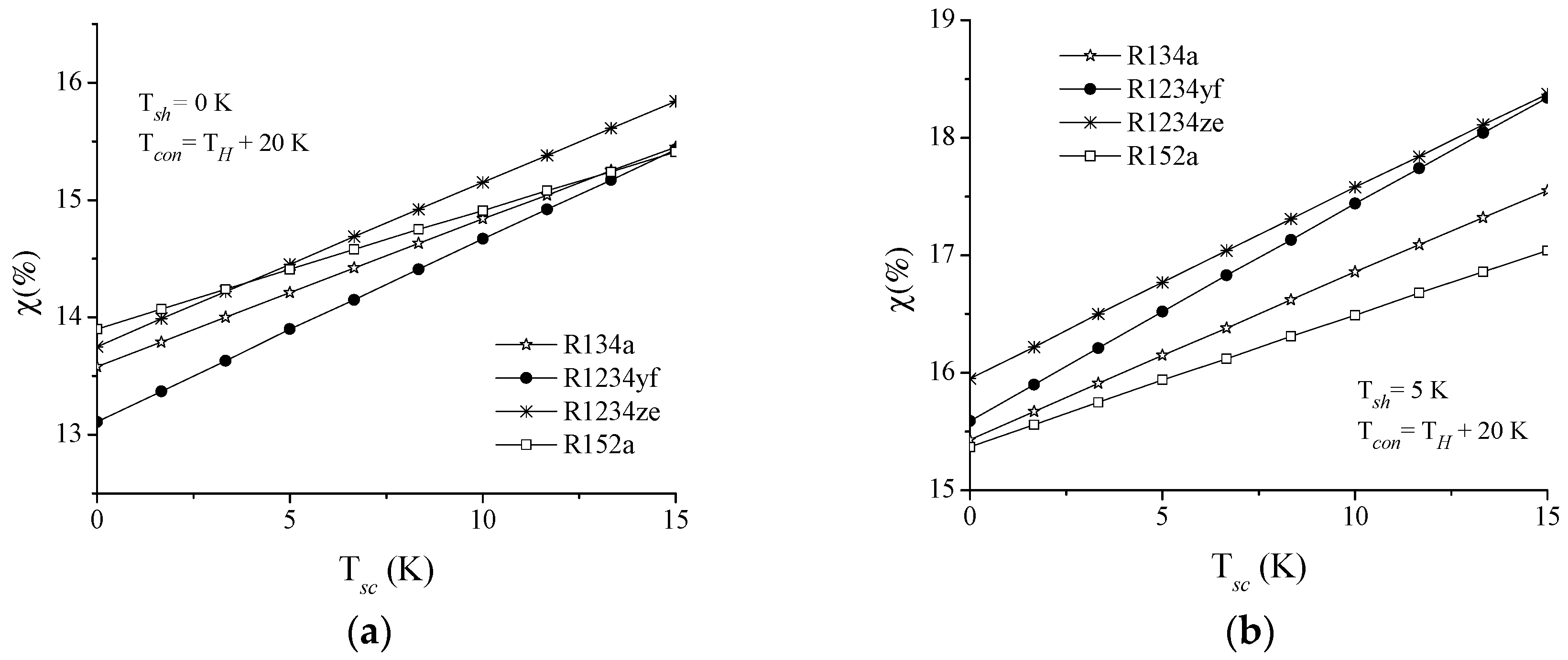 - Lee, Y.; Jung, D. A brief performance comparison of R1234yf and R134a in a bench tester for automobile applications. Appl. Therm. Eng. 2012, 35, 240–242. [Google Scholar] [CrossRef]