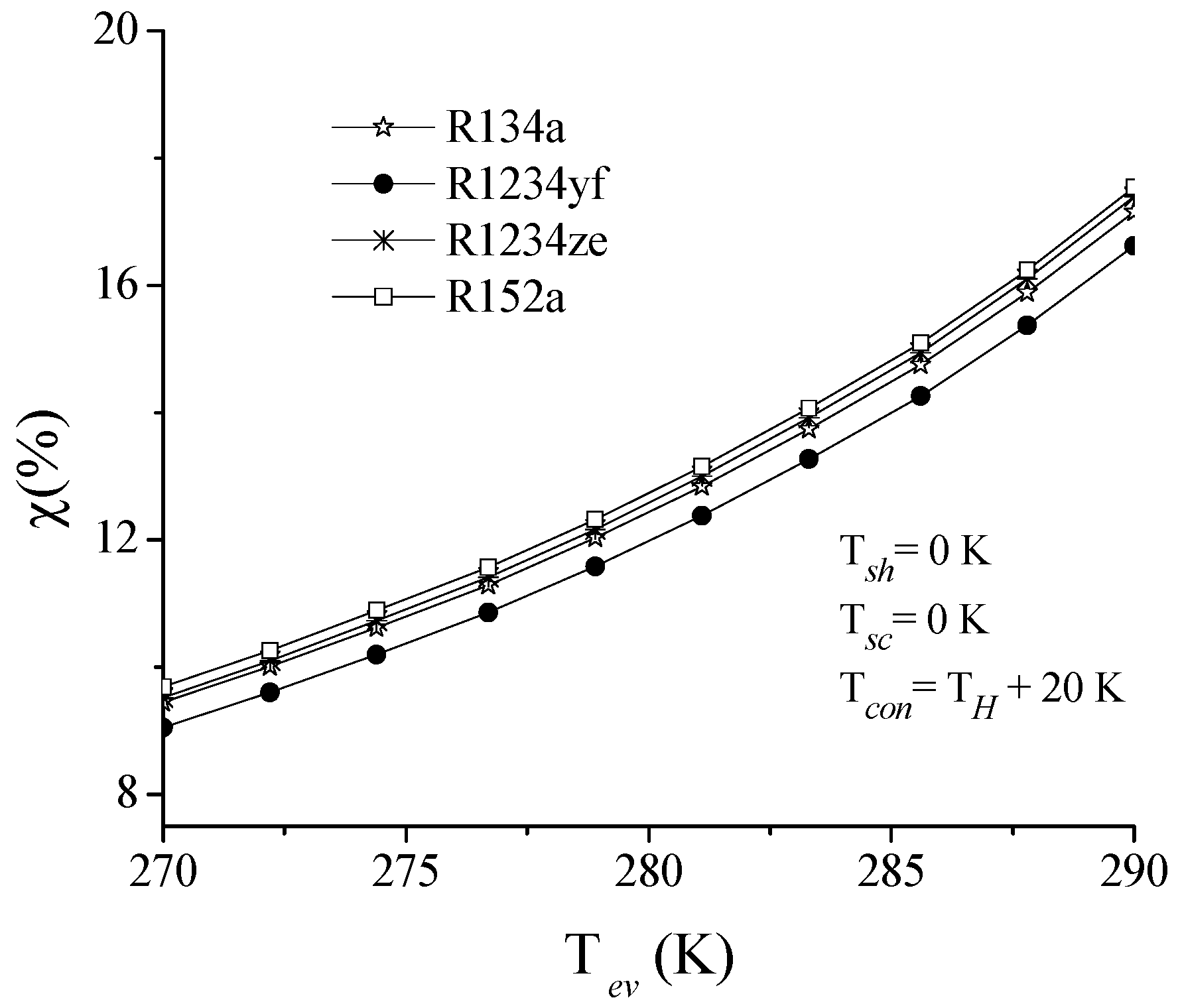 - Özgür, A.E.; Kabul, A.; Önder, K. Exergy analysis of refrigeration systems using an alternative refrigerant (hfo1234yf) to R-134a. Int. J. Low Carbon Technol. Adv. Access 2012, 9, 1–7. [Google Scholar]