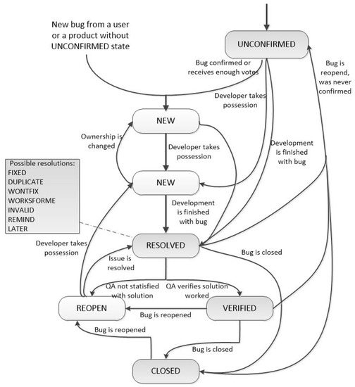 During their lifetime, bugs go through a series of states. Figure 1 depicts the life-cycle of bugs in Bugzilla (see also: http://www.bugzilla.org/docs/tip/html/lifecycle.html).