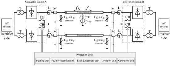 For high-voltage systems, practical data is usually difficult to obtain for research purposes, mathematical modeling is a principle method and widely adopted in analyzing HVDC power systems [19]. Both the short faults and lightning surges can be modeled with the equivalent circuit in Figure 1. When a fault or disturbance occurs, the switch S in Figure 1 would be closed and the source Esurge is connected to the fault point or the contacting point of strikes on the transmission line. Under different conditions, the expression of the source will be different.