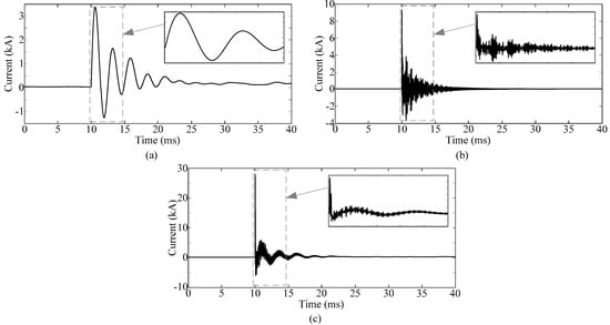 Figure 3 shows the current waveforms of the aforementioned three kinds of traveling surges. Obviously, more oscillations, or high-frequency components, are included in surges caused by lightning strikes.