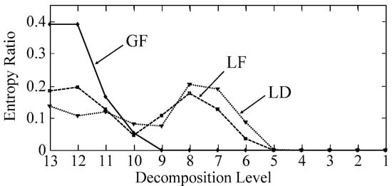 According to Equations (4) and (5), the entropy ratios of the captured signal are calculated. One entropy value is generated by one level of detail coefficients.