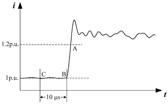 To ensure the whole frequency spectrum is analyzed, the sampling frequency should be higher than 1 MHz/s. The frequency range of traveling surges depends on the length, size, and material of the transmission lines. In order to obtain traveling waves on different transmission lines and cover the oscillation components of traveling surges, the bandwidth of traveling wave sensors should be from at least 100 Hz to greater than 2 MHz. The current traveling surges are recorded for recognition. When current increases to 1.2 p.u., a traveling surge is assumed to arrive. As shown in Figure 7, once a current exceeds 1.2 p.u., or point A, the recorder will trace back to find the last 1 p.u. current value, or point B, and then point C, which is 10 μs before point B. Point C is, thus, chosen to be the starting point of the data window whose length is 3 ms.