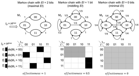 Note that in M1 every state completely constrains both the past and future, while the states of M2 constrain the past/future only to some degree, and finally M3 is entirely unconstrained (the probability of any state-to-state transition is 1/n). This affects the chains’ respective EI values. Assuming that ID = Hmax: EI(M1) = 2 bits, EI(M2) = 1 bit, EI(M3) = 0 bits. Given that the systems are the same size (n) and the same ID is applied to each, their differences in EI stem from their differing levels of effectiveness (Figure 1), a value which is bounded between 0 and 1. Effectiveness (eff) is how successful a causal structure is in turning interventions into unique effects. In Figure 1 the three chains are drawn above their TPMs. Probabilities are represented in grayscale (black is p = 1).