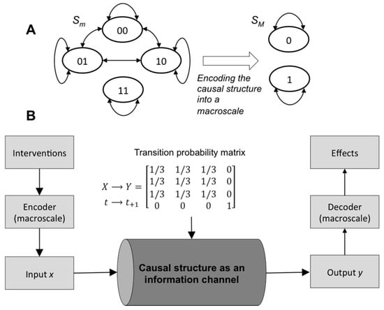 Causal models as information channels. (A) A Markov chain at the microscale with four states can be encoded into a macroscale chain with two states. (B) Causal structure transforms interventions into effects. A macro causal model is a form of encoding for the interventions (inputs) and effects (outputs) that can use a greater amount of the capacity of the channel. TPM probabilities in gray scale.