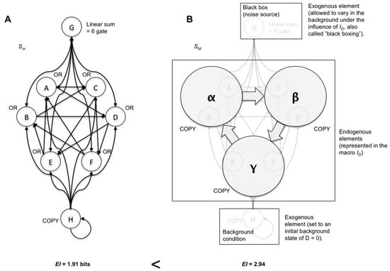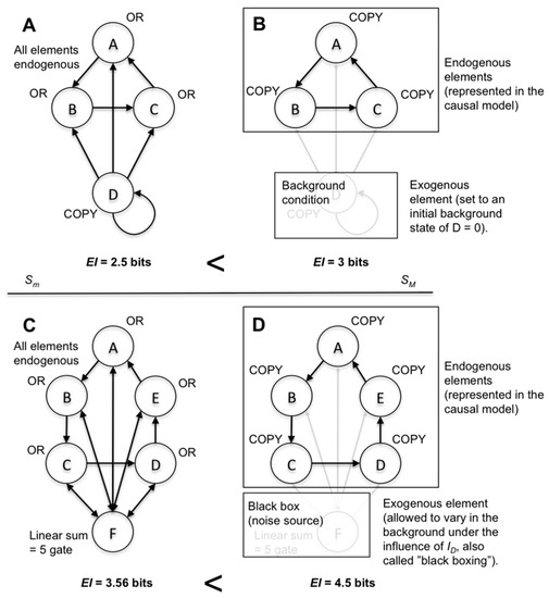 Notably, there are multiple ways to leave elements exogenous (to not explicitly include them in the macro model). For instance, exogenous elements are often implicit background assumptions in causal models. Such background conditions may consist of setting an exogenous element to a particular state (freezing) for the causal analysis, or setting the system to an initial condition. Alternatively, one could allow an element to vary under the influence of the applied ID. This latter form has been called “black boxing”, where an element’s internal workings, or role in the system, cannot be examined [23,24]. In Figure 3, both types of model choices are shown in systems of deterministic interconnected logic gates. Each model choice leads to causal emergence.