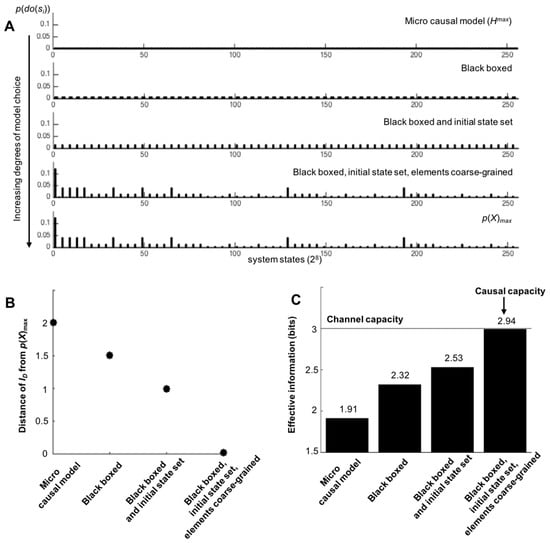 Rather than dictating precisely what types of model choices are “allowable” in the construction of causal models, a more general principle can be distinguished: the more ways to warp ID via model-building choices, the closer the causal capacity approximates the actual channel capacity. For example, consider the system in Figure 4A. In Figure 4B, a macroscale is shown that demonstrates causal emergence using various types of model choice (by coarse-graining, black-boxing an element, and setting a particular initial condition for an exogenous element). As can be seen in Figure 5, the more degrees of freedom in terms of model choice there are, the closer the causal capacity approximates the channel capacity. The channel capacity of this system was found via gradient ascent after the simulation of millions of random probability distributions p(X), searching for the one that maximizes I. Model choice warps the microscale ID in such a way that it moves closer to p(X), as shown in Figure 5B. As model choice increases, the EImax approaches the Imax of the channel capacity (Figure 5C).