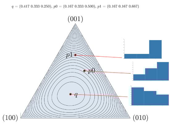 We may now turn to the case of the worst profile update , leading to the highest anonymity risk. Consider two distributions p and q on the discrete support alphabet , representing predefined categories of interest in our context. Recall that p is said to be absolutely continuous with respect to q, denoted , whenever implies for each i. Otherwise, if for some i, we had but , then . In the context at hand, we may assume that the population profile incorporates all categories of interest, so that , which ensures absolute continuity, i.e., . Therefore, we would like to solve