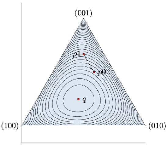 Probability simplices showing, the population distribution q, the user’s profile , and the updated profile .