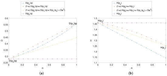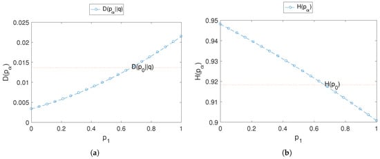 In this example, we consider two categories of interest; therefore, profiles are completely determined by a single scalar p, being the other frequency. We fix the activity parameter , set the historical profile to , the reference profile to , and verify the analysis on the worst anonymity risk update of Section 3.5 plotting (a) against profile updates ranging from 0 to 1. In the entropy case (b), we plot .