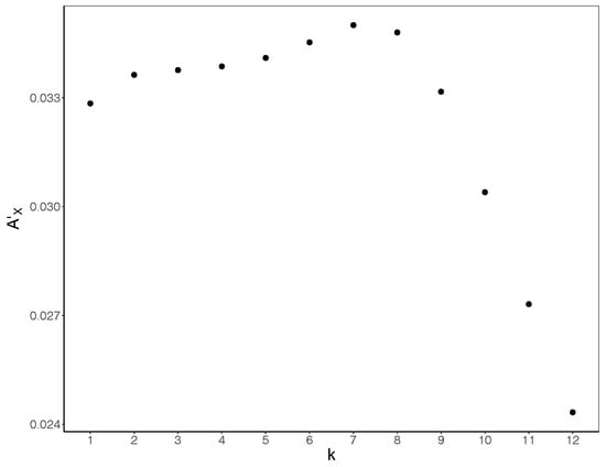 To determine the value of k to use, we calculated the bias-corrected active information storage as per Equation (11) for each run, and then averaged the values across runs for each . Subsequently, we calculated the mean for each embedding length k across all values. The bias-corrected active information storage maximises for (Figure 2) and decreases sharply after . As such, applying the criteria discussed above, we select for the embedding length to be used.