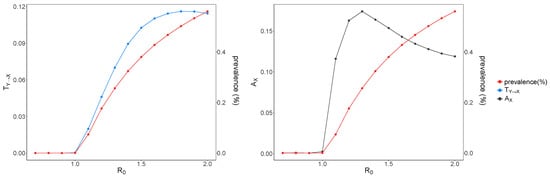 In our simulations, the epidemic dies out without any sustained transmission when , whereas the number of infected individuals reaches an equilibrium when , and the epidemic becomes endemic in the population. We use the mean number of infected individuals throughout the simulation runs to calculate the prevalence for each value, shown in Figure 3.