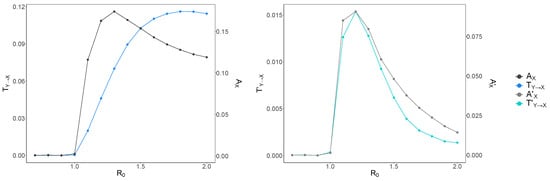 Furthermore, in addition to identifying the peak of information-processing capacity of the underlying computation, which pinpointed an upper bound on the critical basic reproductive ratio , we studied patterns of coherent information structure, via state-space diagrams formed by transfer entropy and active information storage shown in Figure 5. It is evident that both information-processing operations (communications and memory) are tightly interlinked in the underlying computation, suggesting that the studied epidemic process is strongly coherent.