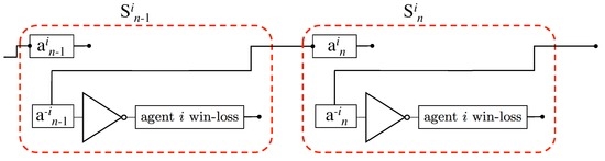 The modified Prisoner’s Dilemma game for agent i based on wins and losses using the Tit-for-Tat (TfT) strategy. and are the game states at time and n, the NOT gate is the logical operator that connects the variable to the win–loss status of the game, in this sense the NOT operator is the logic of the modified PD game. The only connection between successive game states for the TfT strategy is a direct connection between and , and neither agent i’s act nor the win–loss status of the game is in the information set of the TfT strategy. The variable influences the win–loss outcome in a similar diagram for agent just as influences the win–loss outcome for agent i in this diagram.