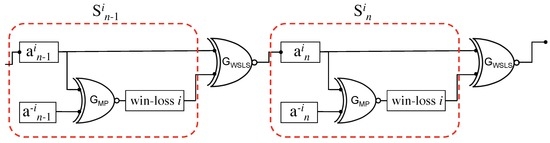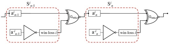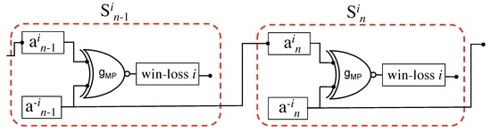 Two steps in the MP iterated game. As for Figure 3, the elements of are related to one another via an XNOR logic gate representation of the MP game. The WSLS strategy is represented as an XNOR logic gate between inputs win–loss} and output . For agent , the gate would be an XOR gate.