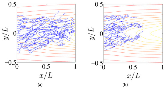 with , in our nondimensional units. This initial condition corresponds to the following initial condition for the stochastic process: There are initial tips at , with vertical positions equally spaced on the interval (), whose initial velocities are normally distributed about with standard deviation 1. Note that, as and tend to zero, Equation (26) becomes