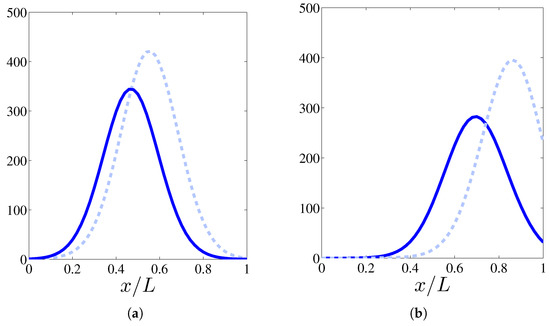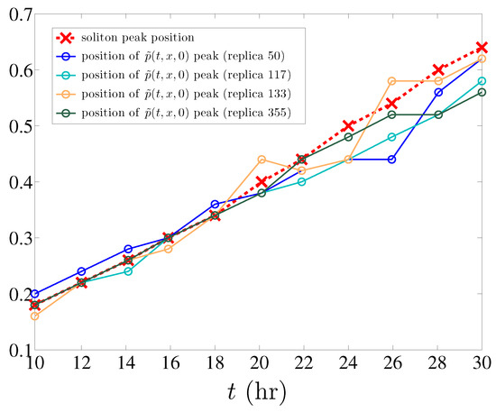 Using the soliton collective coordinates, we reconstruct the marginal vessel tip density and find its maximum value and the location thereof for all times . Figure 5 shows that the location of the soliton as predicted from the CCEs (38) and (39) compares very well with the marginal tip density obtained by ensemble averages (over 400 replicas) of the stochastic process during the 20 h time interval when boundaries do not affect soliton motion. There is a large discrepancy between the maximum marginal tip density as predicted by the soliton and by the stochastic process during the first 10 h of angiogenesis, which clearly marks the duration of the initial stage of soliton formation. After this stage, we note that the location of the maximum of the marginal tip density is very closely predicted by the location of the soliton peak as a function of time. However, the soliton density is noticeably wider than the ensemble averaged marginal density (see Figure 4). This is perhaps not so surprising. (i) The soliton is an approximate solution of Equation (28) for the marginal density that, in itself, is an approximation of (13) valid for large friction. A direct simulation of an overdamped Langevin model (1) with may provide better quantitative agreement with the soliton. Note that we do not have to select the velocity of the new tip branching from a given one in the overdamped case and that the injecting boundary condition (16) becomes given by (19) at [12]. With a few exceptions [5,6,7,9], most models in the literature are overdamped. (ii) The soliton is an approximate solution for an unbounded slab and the influence of the boundaries has to be eliminated by selecting the interval for spatial averaging. In view of Figure 5, we expect that the soliton approximation will improve if we increase the slab size so as to minimize the influence of boundaries.
