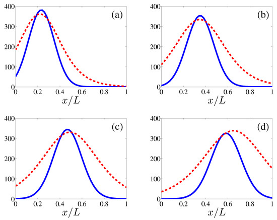 Comparison between the profile of (solid line, calculated by ensemble average over 400 realizations) and its reconstruction from the soliton collective coordinates (dashed line) at times: (a) 12 h; (b) 18 h; (c) 24 h; (d) 30 h.
