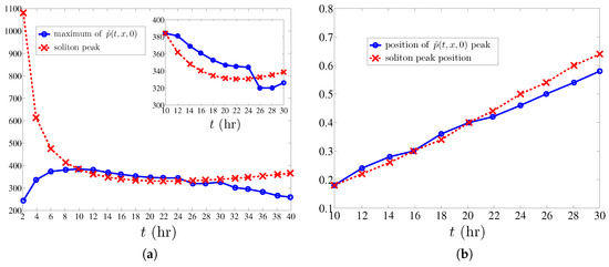 Comparison between the maximum value of (calculated by ensemble average over 400 realizations) and its value as predicted by soliton collective coordinates. (a): evolution of the maximum value of the marginal tip density (relative error smaller than 5.8% for times between 10 and 30 h); (b): evolution of the position of the maximum marginal tip density on (at h, the absolute error is the space step in the numerical method, ; at h, the error is ). We have used an anastomosis coefficient .